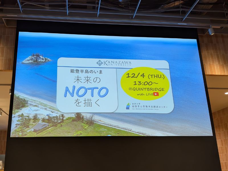 京橋にあるクイントブリッジで行われた「能登半島のいま 未来のNOTOを描く」というイベントです。主催は金沢大学の能登里山里海未来創造センターというところ。11月に和倉温泉へ行って、関心が高まっていたため伺いました。